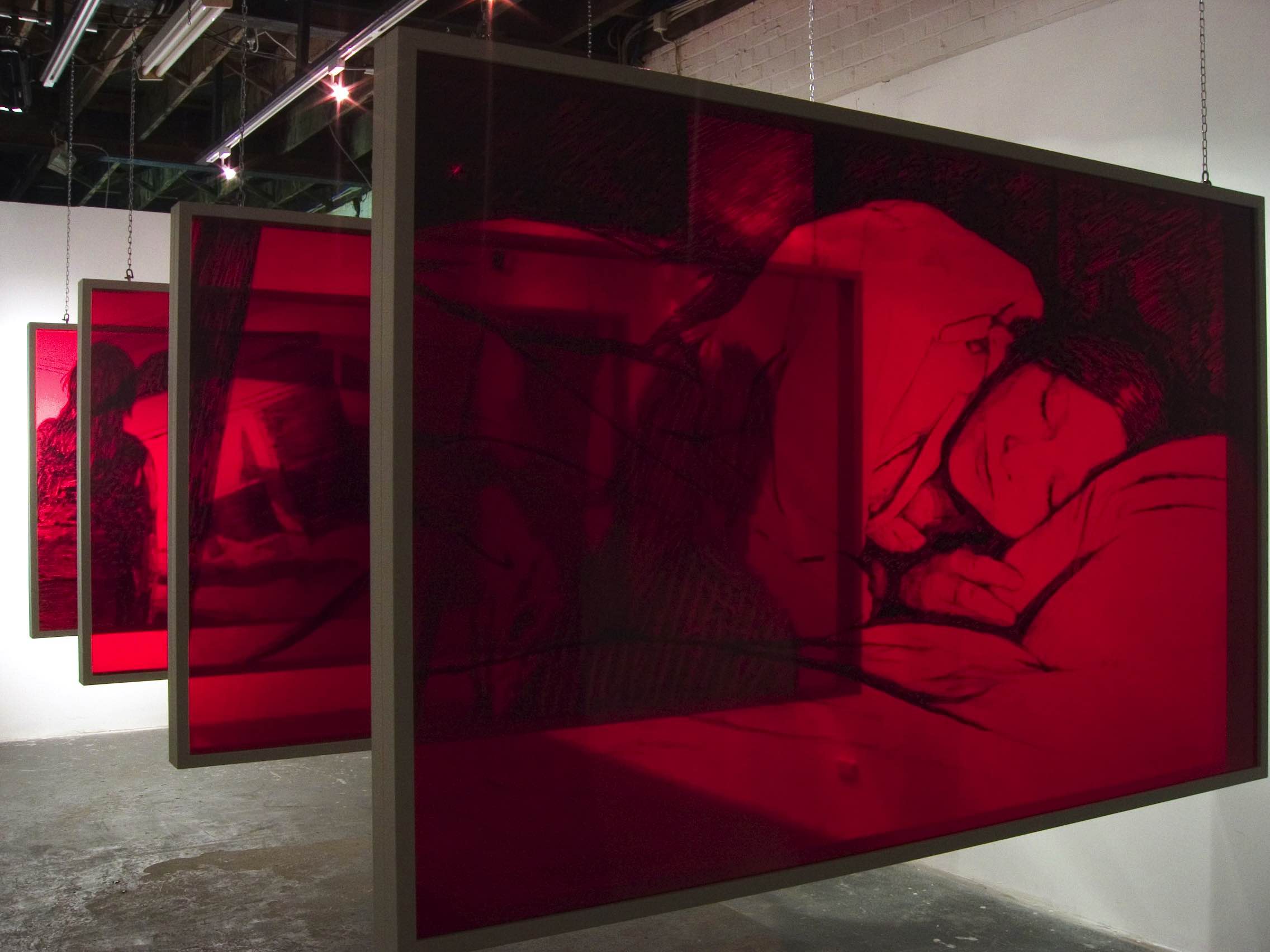 Sleepwalker: dreams & cinema is an installation suspended between film and dreams. In a sequence of four translucent panels four real dreams belonging to Lily or her close friends and sister are recreated in the style of four corresponding movies. These "cinematic dreams” raise the possibility that our dreams might be the unconscious product of films we have seen. Or that movies evolved because our dreams have always been cinematic: made of pure images and allegories.