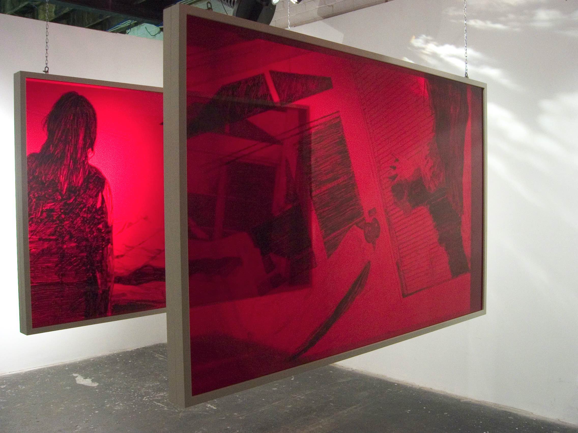 The imagery is drawn onto large coloured acrylic sheets, which are illuminated by theatrical lights to create the effect of stained glass windows. A single sequence of panels was displayed in 2004 for Lily Hibberd's solo exhibition at Kings ARI, Melbourne, Australia.