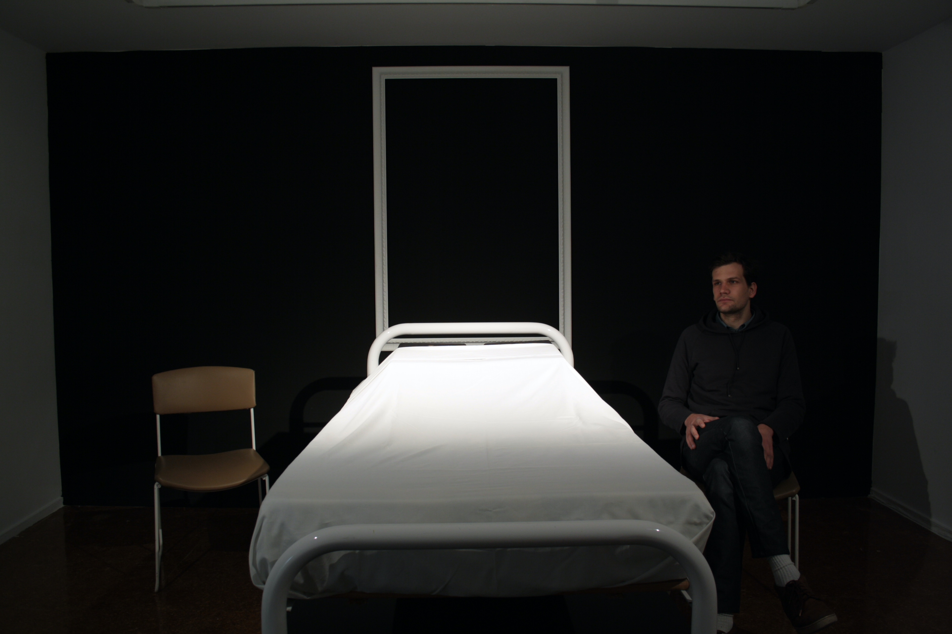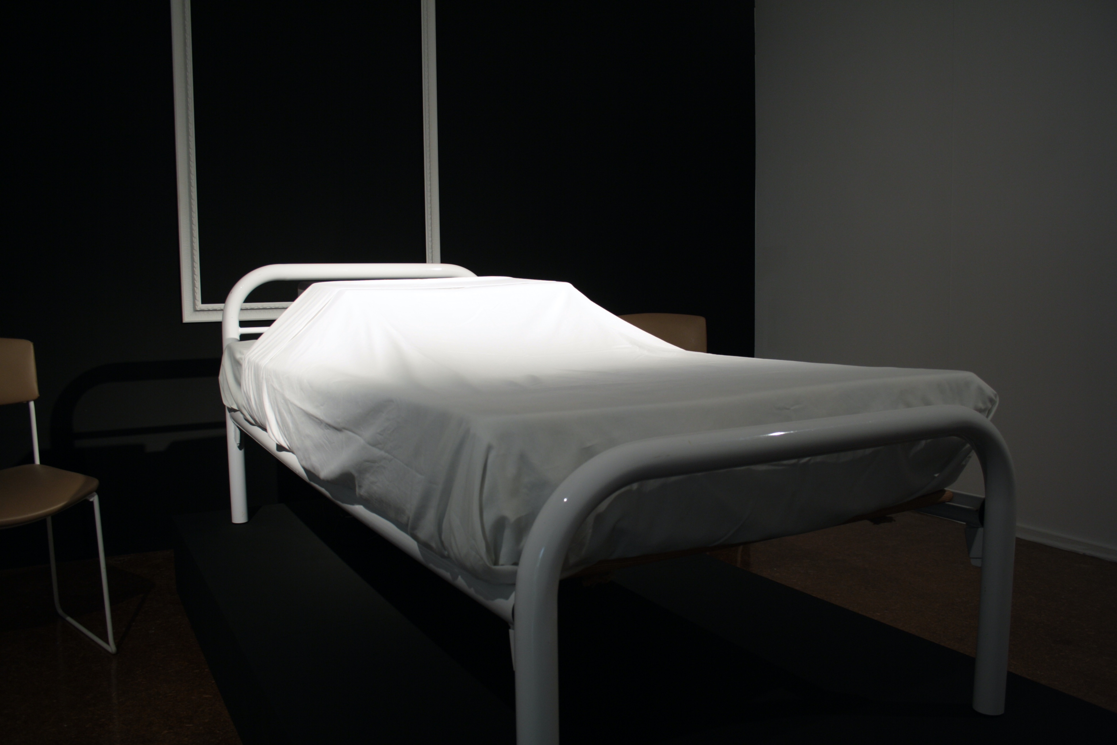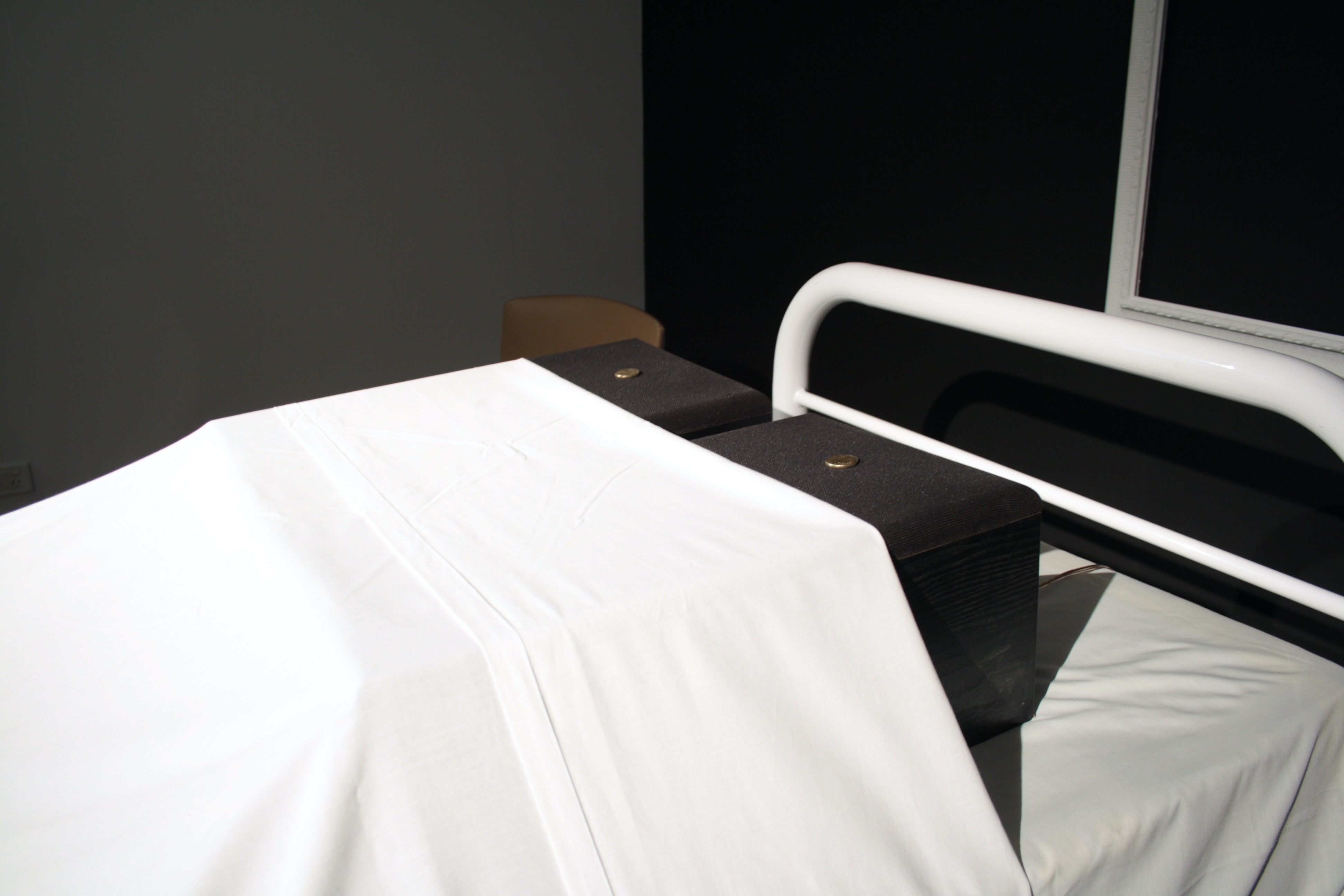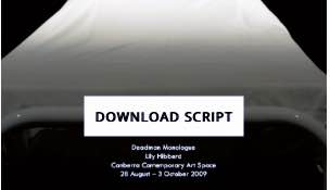 Deadman Monologue is a sound installation created by Lily Hibberd for a solo exhibition at Canberra Contemporary Art Space in 2009. The setting is comprised of a single bed in an empty room. Two loudspeakers are laid side by side on the bed, covered by a white sheet. The bedhead is against a black wall with a large white frame is hanging above it. The frame is empty. A 30-minute monologue emits from the speakers, playing in a loop.