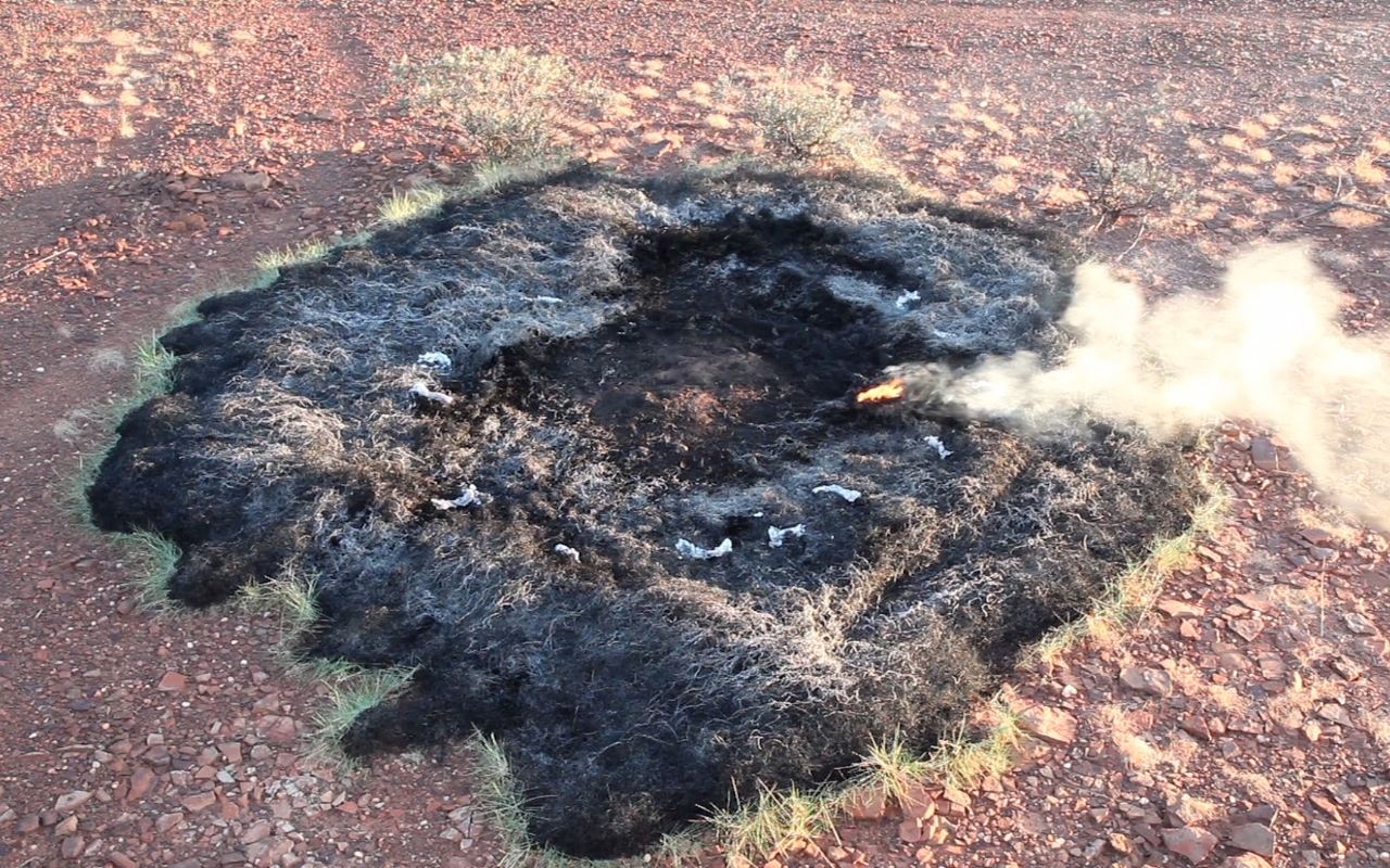 In this nine minute performance video, I lie in a grass circle in the Western Desert, where an ecology of fire reignites the seeds that lie in wait. I read aloud extracts from the story of 'Maria: or The Wrongs of Woman' by Mary Wollstonecraft, published after her death in 1798. Abandoned by her husband to an asylum and divorced from her child, Maria is dead to society, an archetype of uselessness. The shadow of a dead star passes over the expiring Sun. However fearful, this moment is a state of change and not a conclusion for the woman, the fire and the eclipse have this in common: a future born of erasure and loss.
